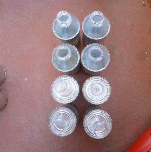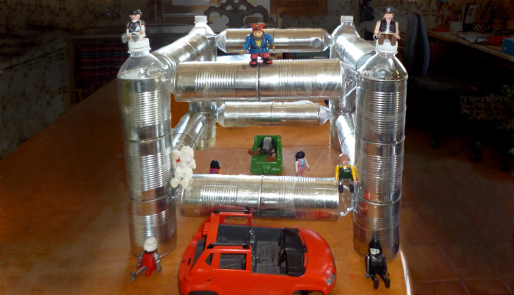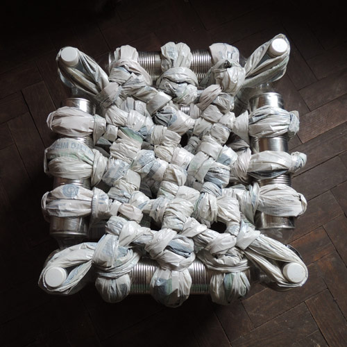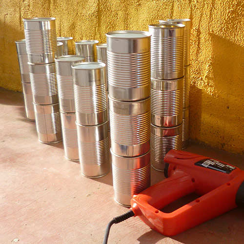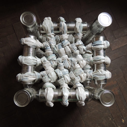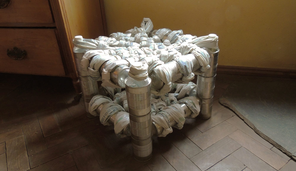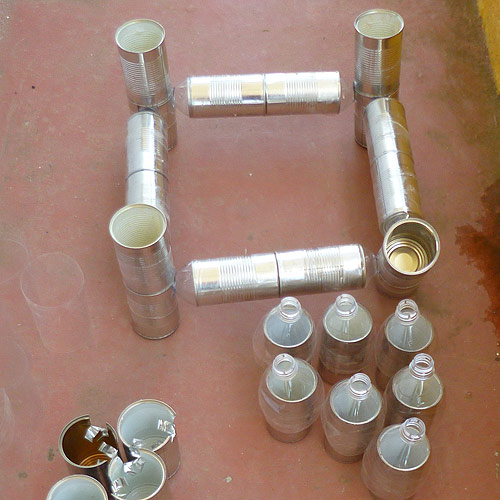 A project to investigate heat shrinking plastic bottles to connect tin cans. The cans join together with a really strong bond. This was my first attempt at making a structure from the cans. As corner joints I cut sections from the corner cans to slot in the necks of the bottles.