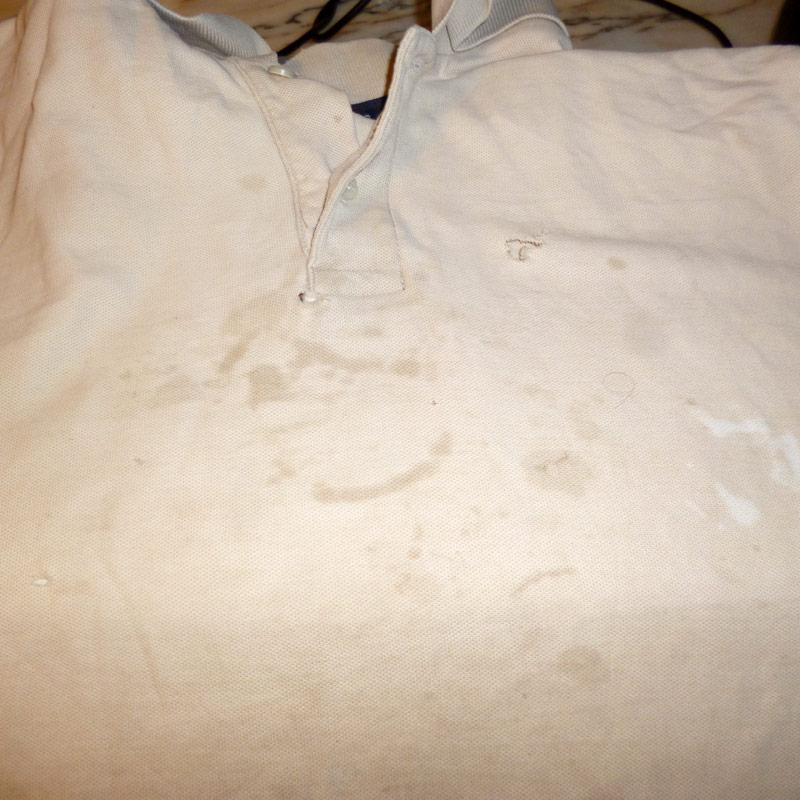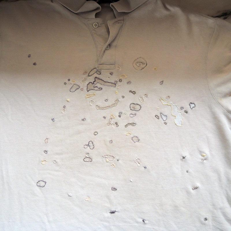 When I read a bout Kate Sekules’ Greasytee idea I knew I had the ultimate candidate to try it out on. I have been trying to convince my son that this t-shirt is past the point of being worn but he insists otherwise. In his defence, he does wear this in the workshop working with oils, paints etc.