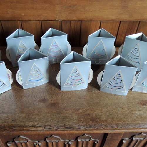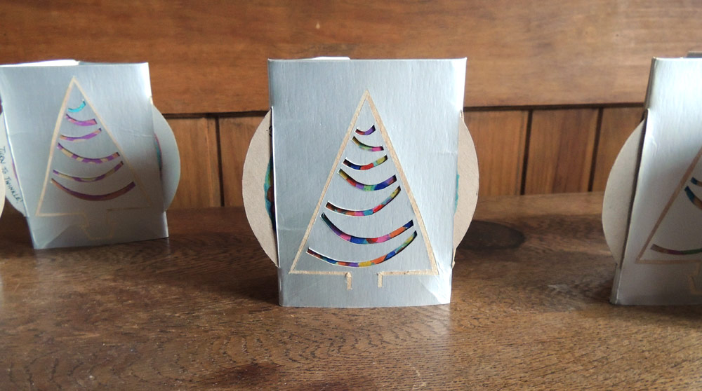 Mine are made using Tetra Pak left over from the rocket project, so they were already cut open flat. The tringle stand up design utilises the panels already there and are similar to last years cards. and they have a peeled foil design.