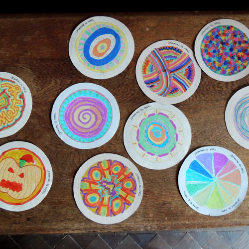Out of the patterns of the discs we found that the spotty design worked best, followed by the stripes, but this may be partly to do with using felt tips that weren’t running out so the colours were brighter….