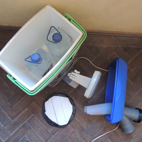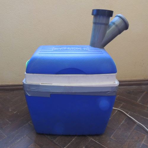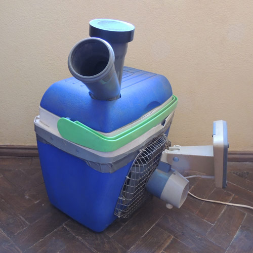 It works by rotating a couple of water bottles from the freezer. It’s not the prettiest, but it works a treat and I find it a lifesaver when the temperature soars over 37 degrees. We made it a few years ago and its still going strong.