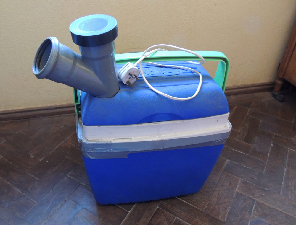 It’s not compact but its portable! This handy air conditioner is made from an old cracked cooler box (fixed with a little duct tape). We cut a hole in the side to mount an old electric fan and a pipe in the lid to channel the cool air. The pipe has a lid so you can choose the direction you want the cool air to flow.