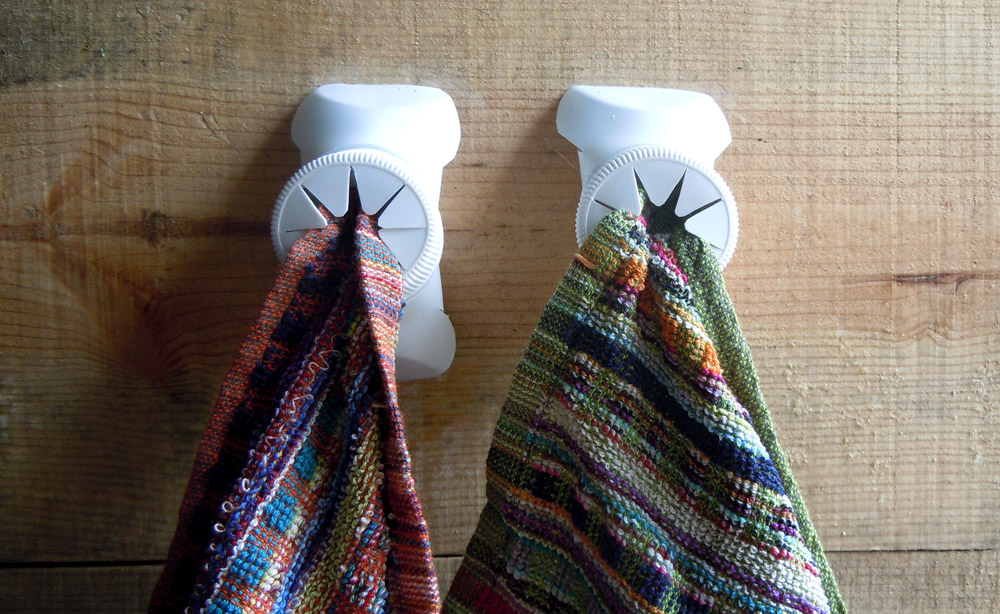 These towel grabbers grip the corner of the tea towels, holding them firmly in place. I’ve designed them to have replaceable parts, so they’ll last indefinitely and they’re also recyclable. The cap still unscrews so you can take that off to clean or replace.