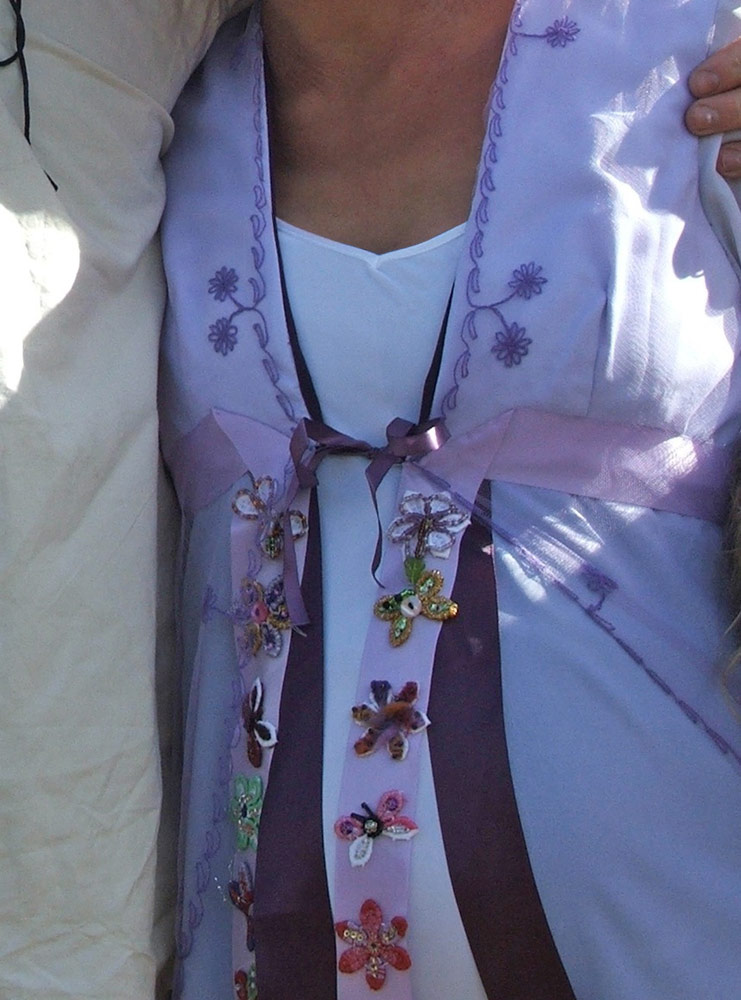 I was fortunate to have two weddings (to the same person!), one in the Southern hemisphere and one in the North. I knew my family and friends weren’t going to be there the first time so I came up with the idea of using the lace from the dress in a way that would involve them. I cut the flowers and butterflies into individuals and sent them to the people I would have invited and asked them to embellish them by embroidery, beads, paint – anything they felt like. They kindly sent them back beautifully adorned and I sewed them onto long ribbons attached to the front of the dress. This way my friends and family were with me.