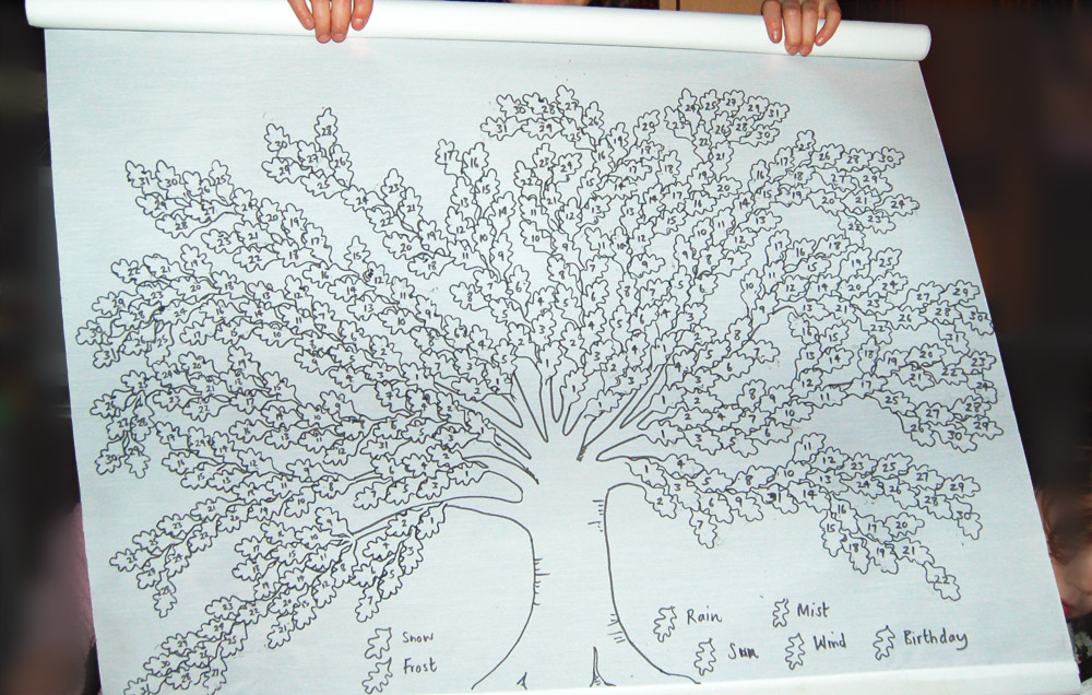 I sketched 12 branches and cut a template of a leaf to draw 366 days (it’s a leap year). This was a gift along with a packet of fabric pens.